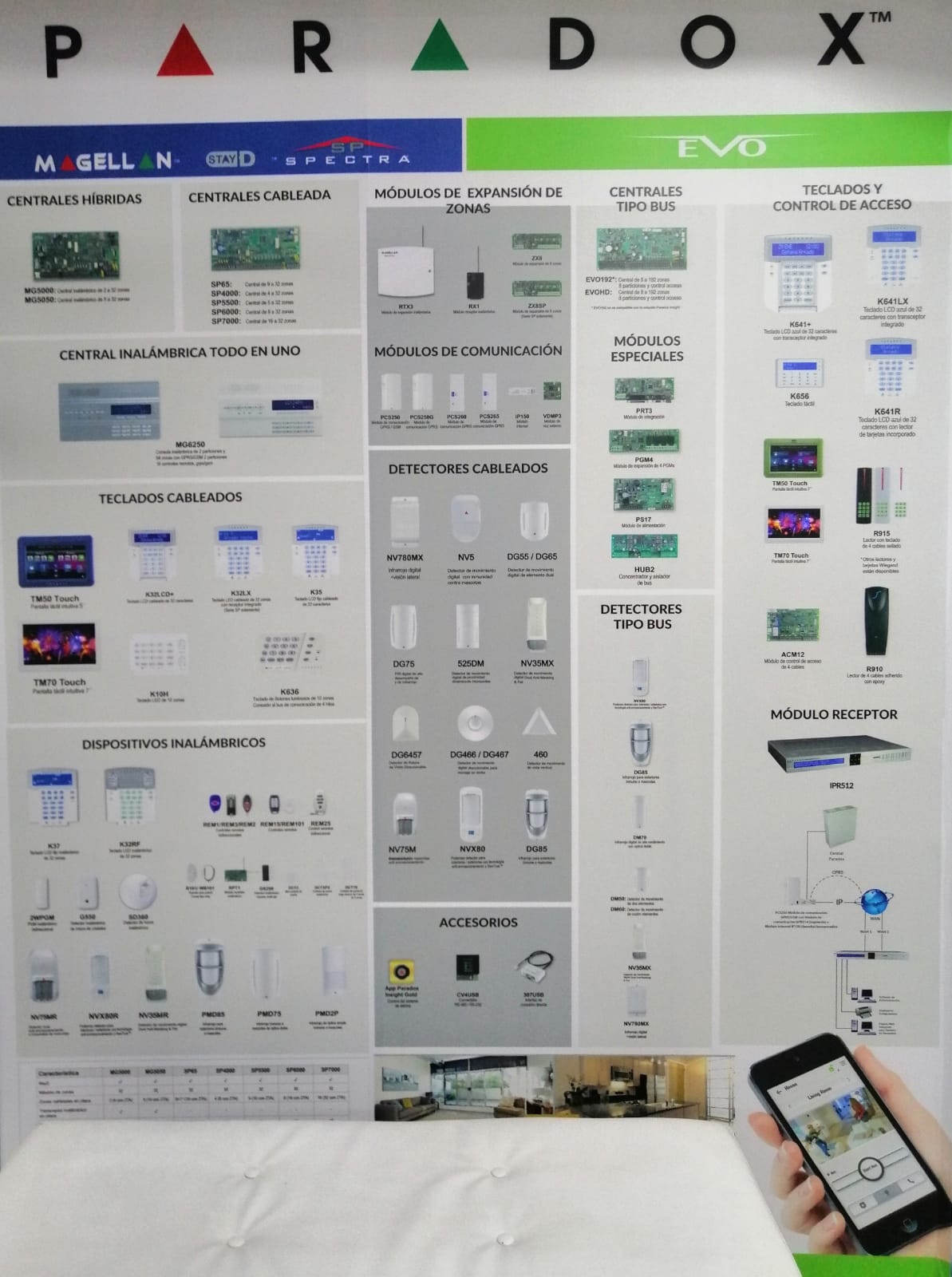 Dispositivos para sistemas de alarma de intrusión, incendio y controles de acceso como sensores de movimiento, infrarrojos, sensores de humo, teclados, tarjetas de control, paneles, módulos receptores y repetidores.